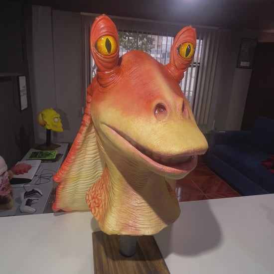 This is a sculpture made of latex and filled with foam. It's available in two versions: a sculpture for exhibition and a wearable mask. The wearable mask version has an open mouth, allowing you to see and breathe.